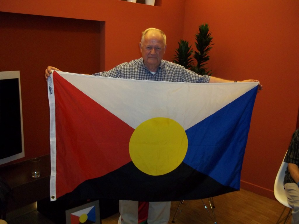 Finally, we had an extremely interesting presentation by David Ferriday on this flag he designed and had manufactured by Elmer’s Flag and Banner. David talked about how he was personally left cold by the idea of “personal flags” that represent individual people. Instead, he wanted to design a flag for all the people’s of this 21st Century, one that would reflect themes from science and nature rather than from religion and divisive politics. The flag design represents the Four Elements of various ancient cultures (radiating triangles of black for earth, white for air, red for fire, and blue for water) on which is centered a yellow disc, representing the Sun which is the source of the Earth and everything upon it.  David will be writing up as only he can a full description of this beautiful flag and how it came about.