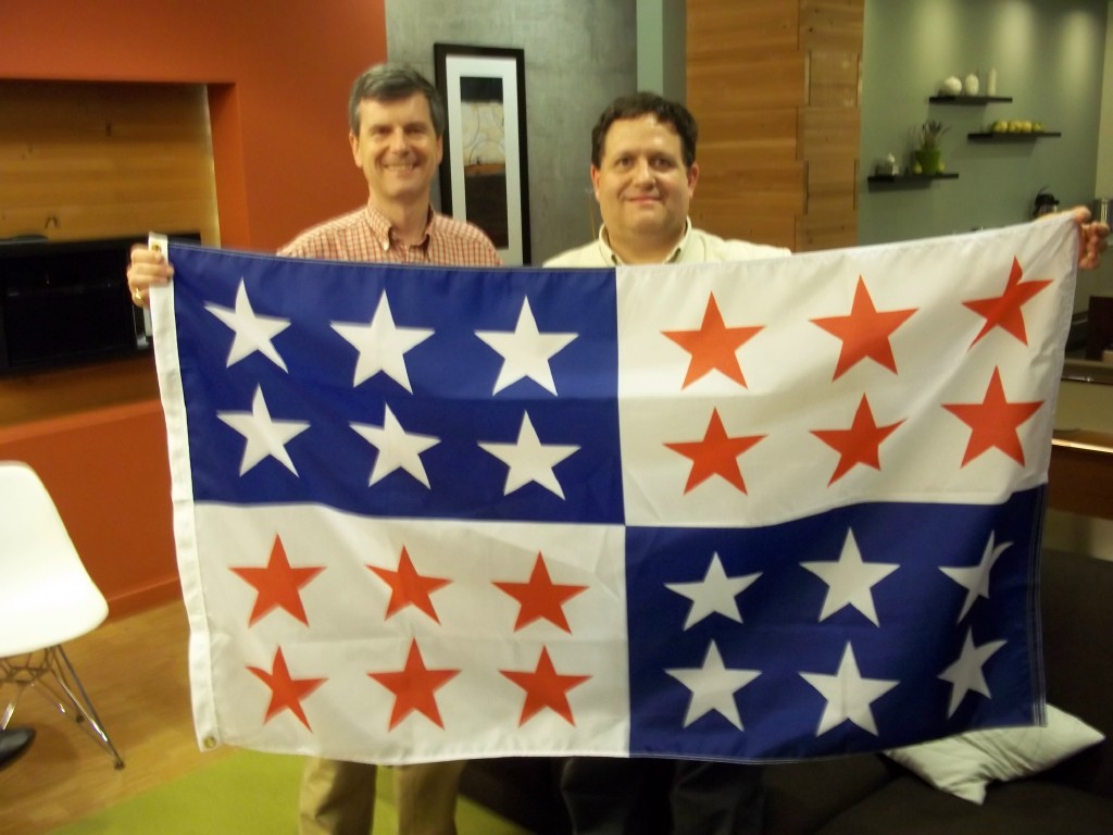Michael also showed us his newly acquired and apparently freshly manufactured Flag of the State of Jefferson (counties of southern Oregon and northern California which wanted to secede in 1941 due be being “double crossed” by the distant capitals of Sacramento and Salem — but Pearl Harbor put that movement into indefinite haitus). Turns out Ted Kaye is an expert on the subject — anyone interested should contact Ted for a copy his paper “The State of Jefferson” that appeared in The Flag Bulletin, Number 150: Pseudostates and Their Flags (Vol. XXXII, No. 1, January-February 1993, pp. 22-30, published by Whitney Smith’s Flag Research Center).