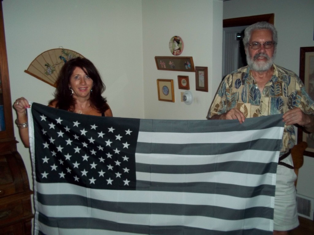 Michael Orelove brought the monochrome flag pictured here held by his cousin Gary and his friend Mary, and lead a brief ontological discussion about just what counts as an American Flag anyway? Patrick Genna was reminded of a similar flag he found at Paramount Flag in San Francisco back in the day, that was light green, dark green, and white instead of grey, black, and white. Scott talked about how it was interesting that both the Tea Party and the hip hop community both use this flag (in the latter case, it was prominently featured in the music video for “Put On” by Young Jeezy featuring Kanye West). Poking around a little on the web, here is what urbandictionary.com has to say: