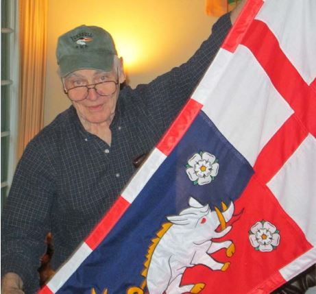The flags of the State of Oregon, the United States (48 stars, 1912-1959), and the 41st Infantry Division, with battle streamers, decorate the gymnasium foyer at Camp Withycombe, the Oregon National Guard base.New PFA member Sam Oakland shares his custom-ordered Richard III banner.International flags fly from the home of Bill Hilliard, retired editor of The Oregonian, as mementos of his global travels advancing press freedom.Portland Flag Association delegate Max Liberman presents a persuasive case for PFA’s membership in the International Federation of Vexillological Associations (know by its French acronym, FIAV), at the 25th International Congress of Vexillology in Rotterdam.Fans of the Portland Thorns women’s soccer team have created a version of the Portland flag, using the team colors of red, green, and black. They told photographer David Ferriday that the artwork is on file at Elmer’s Flag & Banner.“Georgia on My Mind” — Sam Oakland and one of his many cross-themed flags