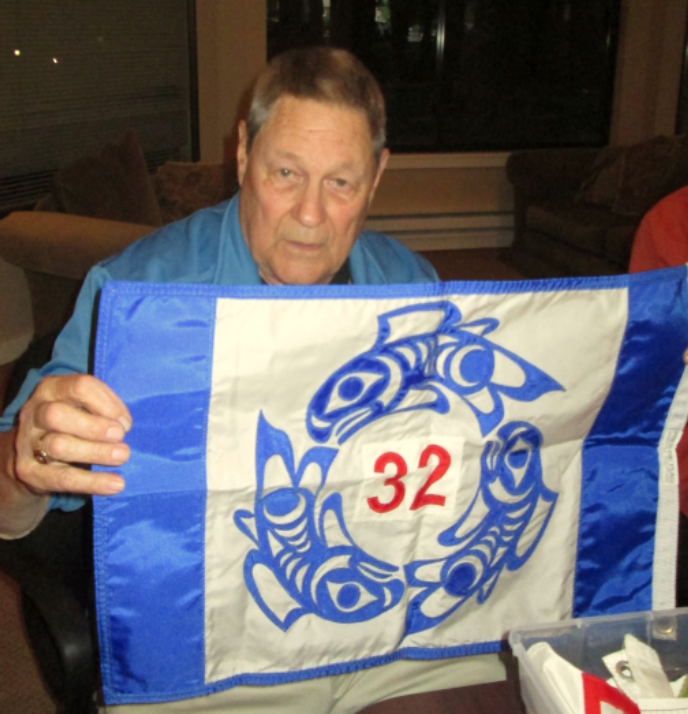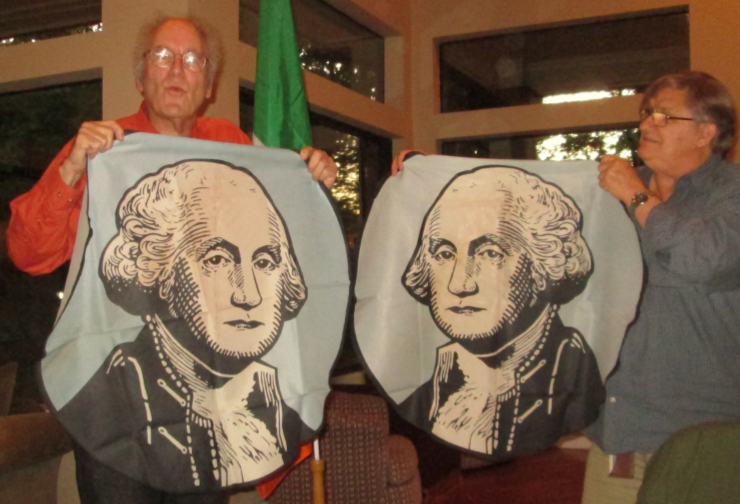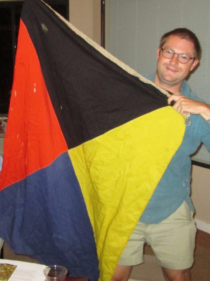 “Zulu” says Carl Larson, showing one of many maritime flags he’s acquired.“Stare at the center star until your patriotism increases.” (Sources: http:/www.deceptology.com/2012/07/the-american-flag-optical-illusion.html http://photos1.blogger.com/x/blogger/5639/2020/1600/615733/unionjackafterimg.jpg)The Alaska flag in Michael Orelove’s “flower bed”. The blue flowers are lobelia, (“Crystal Palace”); the second star is correctly depicted as a multiple-star system.By deconstructing an actual flag, Michael Orelove (L) demonstrates that Washington’s obverse is actually the mirror image of its reverse (so George always faces the hoist).Larry Snyder designed the flag for U.S. Power Squadron District 32.Lindsey Matson delves into the world of alternate history flags.In the evening’s most popular topic, Patrick Genna explains the history of the Union Flag and explores the vexillographic implications of Scottish independence.Cupcakes in the PFA / Portland flag colors, courtesy of Keryn Anchel.David Ferriday (L) and Carl Larson (R) with historic US flags poster.John Niggley recalls the recent 2014 FIFA World Cup with a licensed flag.A Pennsylvania native, Dave Anchel describes the flags of the Civil War held in its capitol’s collection.FLAT BAG, c. 1885 Glass beads on hide with cotton lining. The Elizabeth Cole Butler Collection, 2012.25.72. Note the unusual color reversals in what is still clearly meant as a U.S. flag. (On display at the Portland Art Museum.)The Portland Pedalpalooza Bike Festival uses the flag of Portland (along with Cascadia’s) to promote an eclectic mix of over 260 events. (Source: Portland Mercury 6/4/2014)