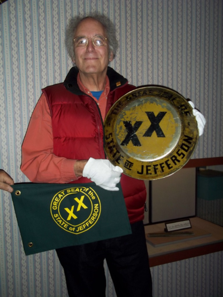 The original seal of the State of Jefferson is at the Siskiyou County Museum in Yreka. Kathleen and I went to the museum to see the gold pan, which was in the vault. After seeing our Jefferson flag and hearing that I was a member of the Portland Flag Association, the staff put on white gloves and brought out the pan from the vault. I also put on white gloves and held both the pan and the flag for a photo.