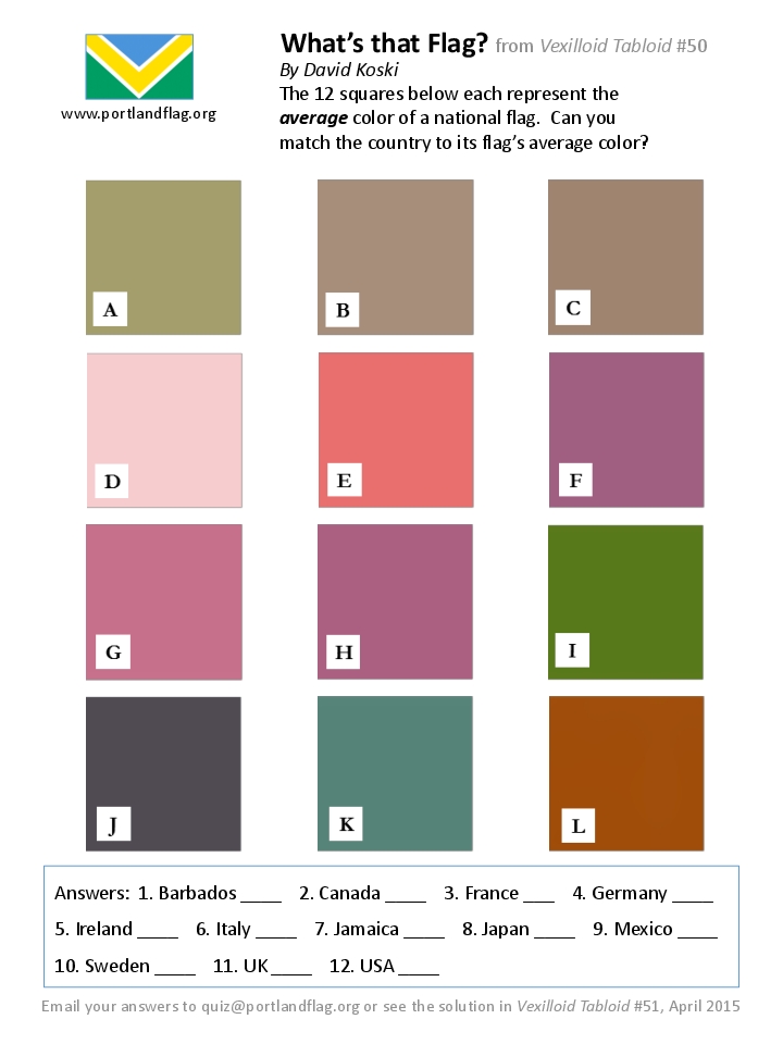 Can you distinguish 12 national flags using only their average color? Email your answers to quiz@portlandflag.org, or wait for the solution to be revealed in the next Vexilloid Tabloid.
