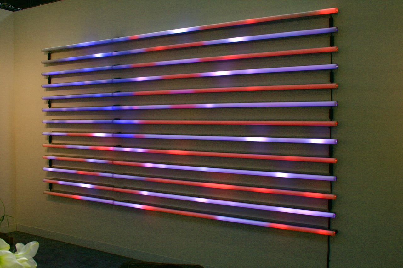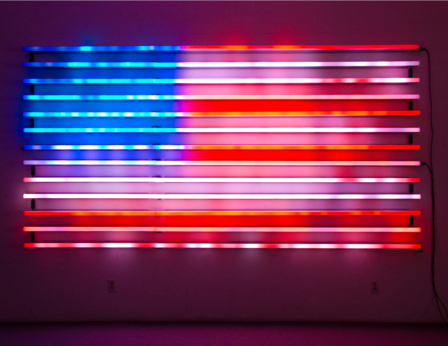 His 2008 sculpture Flag consists of 13 narrow strips (stripes) of enclosed LED lights, with the gaps between them roughly three times wider than the stripes themselves. Colors spill out from each stripe, illuminating the gaps between them, sometimes more strikingly than the light-strips themselves. The blue “union” of the flag is set apart only by color, rather than structure. Proportions of the piece are correct for a US flag: 1.9 times longer than it is tall.