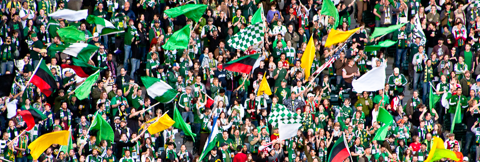 Green’s pride hierarchy also provides a way to think about the relationship between the “visual branding” of the Major League Soccer Portland Timbers and the city of Portland. When the Timbers were promoted from minor league to major league status in 2011, the Portland city flag was seldom seen — in the city, or at their games. It flew in the city at city hall and in the main public square, and at a few other sites. It flew at Timbers games from a stadium flagpole, and the fanatical Timbers Army waved some in the stands, but not as much as they waved Timbers logo flags, Cascadia flags, and even green-and-white Nigerian flags.