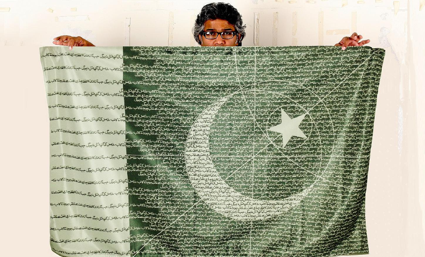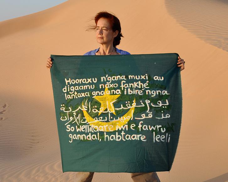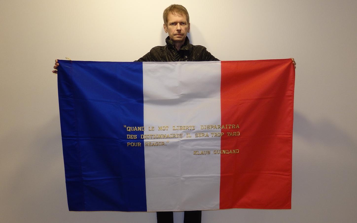 Each artist wrote this sentence on their home country’s flag, translated if necessary into their national language(s). (135 languages are thus represented.) Guingand asserts: