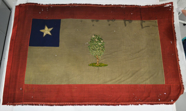 Flag of the Confederate state of Mississippi, captured by the 2nd Iowa Cavalry on 30 May 1862, now at the State Historical Society of Iowa. The tree is a Southern Magnolia (Magnolia grandiflora). Source: Historical Flags article “Mississippi’s Magnolia Flags” by Clay Moss.