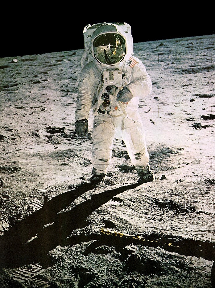 Buzz Aldrin salutes the US flag on the Moon’s Sea of Tranquillity, landing site of Apollo 11, June 1969. Photograph by Neil Armstrong. Detail from photo AS11-40-5875 from the NASA’s Apollo 11 Image Library.