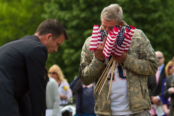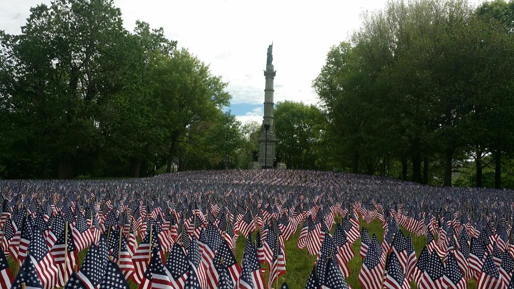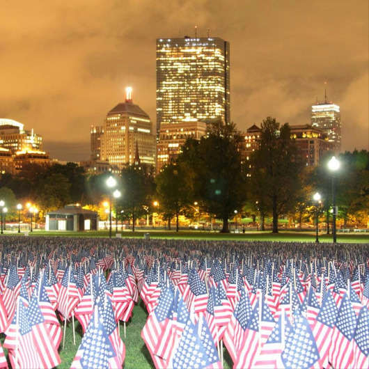 Since 2009, every Memorial Day weekend volunteers for the Massachusetts Military Heroes Fund plant a “memorial garden” of small US flags around the Soldiers and Sailors Monument on the Boston Common. Each represents a Massachusetts life lost in military service.