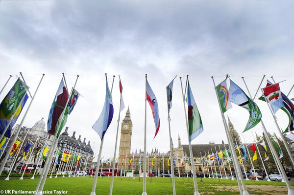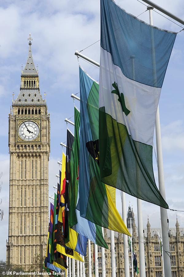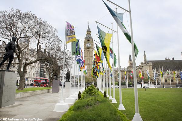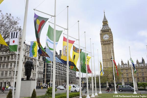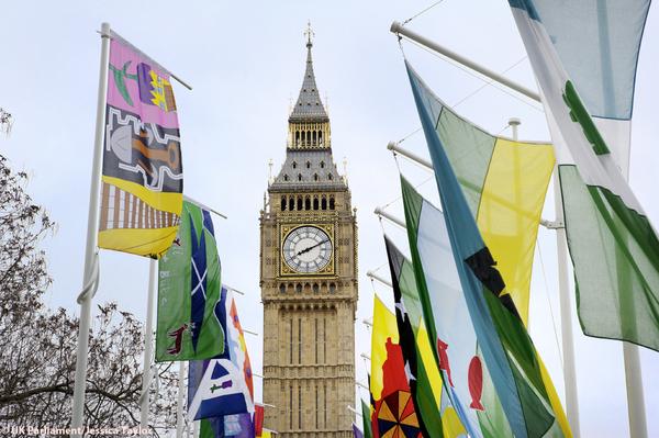 Last March we introduced Jonathan Parsons’ Parliament Flag Project, a nation-wide design contest for young Britons aged 7 to 11. This month 80 of the winning flags have been flying at Parliament Square in London, and they look great. Here are some photos (by Jessica Taylor for the UK Parliament).