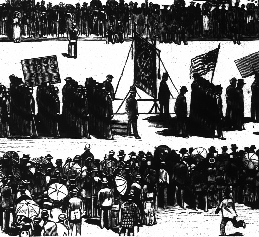 Amidst many US flags, a banner (presumably of representing a labor union) on a frame. Detail from the lithograph above.