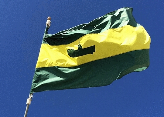 The second is a flag photographed in August 2014 in Pacific City, Oregon, flying next to a US flag near the beach. It is a green-yellow-green tribar with the silhouette of what appears to be a specific kind of motorboat on the central stripe. The boat has a high bow and a structure, probably a pilothouse, amidships. If you can identify this flag — or the boat — please let us know at info@portlandflag.org.