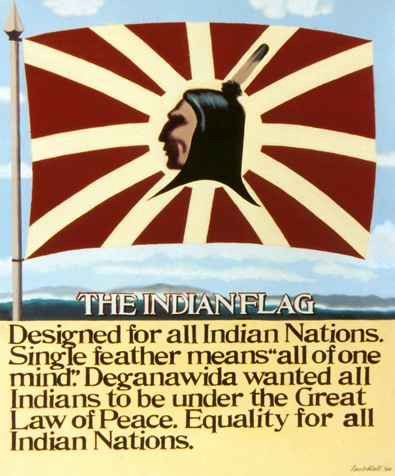 The flag is a variant of the flag of the Mohawk Warrior Society, one of a series of flags designed by the artist Louis Karoniaktajeh Hall. Other flags in the series include the “Indian Flag” showing a “long haired indigenous person,” and versions showing both a man and a woman.