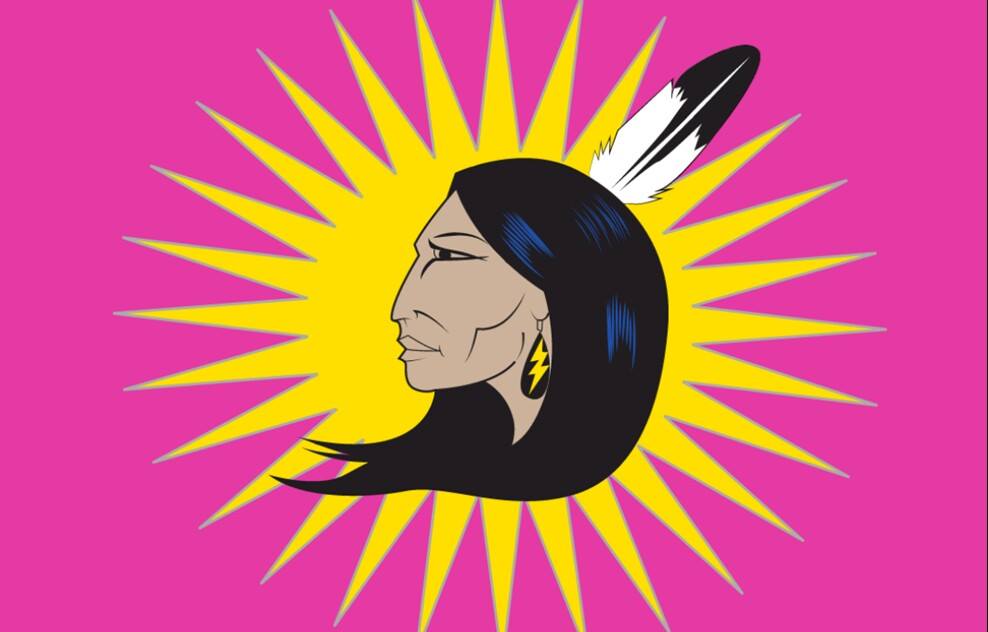 Ieweras means “she helps bring the thunder and lightning” — a warrior’s name given to her because she was born during a thunderstorm in Cornwall, Ontario. The thunderbolt earring shown on the flag references this.