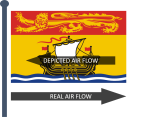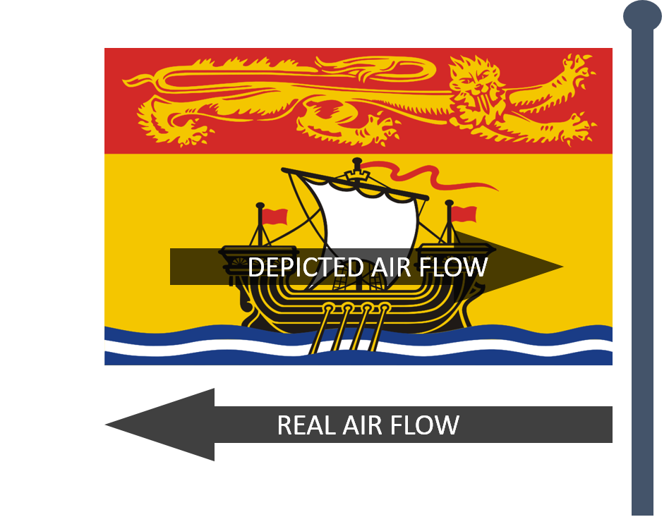But to resume, heraldically-speaking, there is absolutely nothing wrong with the flag of New Brunswick as it was designed. Personally, I suspect that the designer must have encountered this same question of the wind, flag and billowing sail direction and, likely after some research, ended up properly rendering the design.