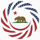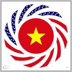 In the blog half of her project, Patriot Survey Says!!, Yo has been collecting “stories honoring your personal multinational journeys.” The other half of the project is vexillographically fascinating: the use of circular, roundel-like combinations of national flags. Each consists of an outer ring made up of elements of a national flag, surrounding an inner disk made up of part of, or elements from, a second nation’s flag. (Yo sells clothing using these proprietary designs on Redbubble.com.)
