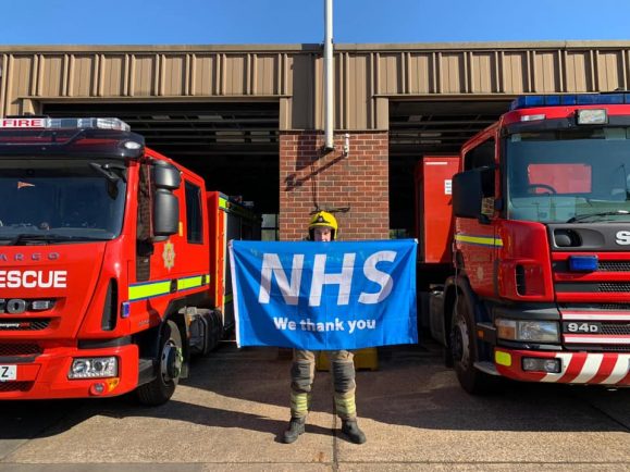 16 April. “Warwickshire [UK] Fire and Rescue Service will be flying an “NHS – we thank you” flag from each of its 17 stations from 8pm in tribute to our NHS staff working tirelessly to save lives during the coronavirus crisis.”