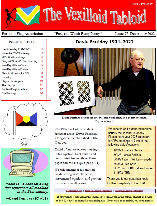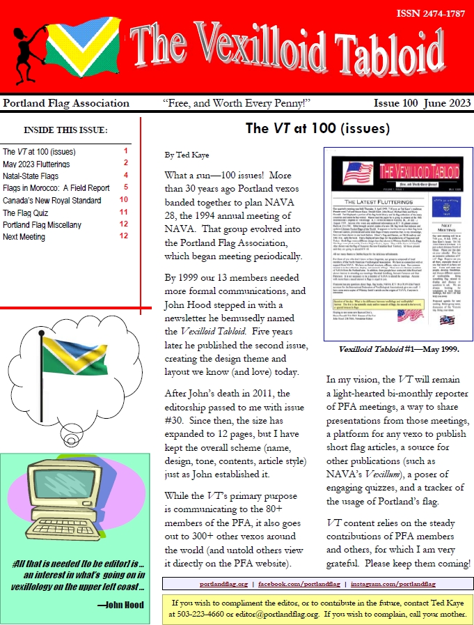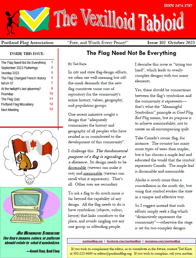 The 78th edition of our newsletter, The Vexilloid Tabloid, is here. It features: VexiDay 2019 (Željko Heimer)Alternatives for Similar Flags (Izzy Núñez)Flags Sent to the Future (Michael Orelove)VexiDay 2019 in Portland (Ted Kaye)What State Are YOU From? (Michael Orelove)State Flags with Lettering or SealsKindergartners and Flags (Ted Kaye) And, as always highlights from our last… Continue reading Vexilloid Tabloid #78