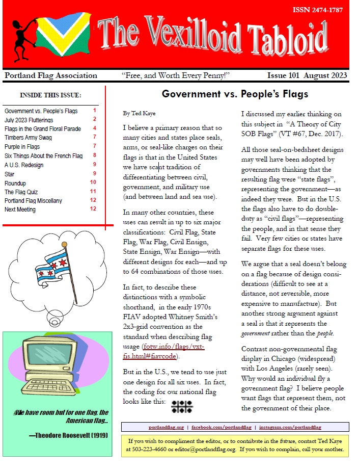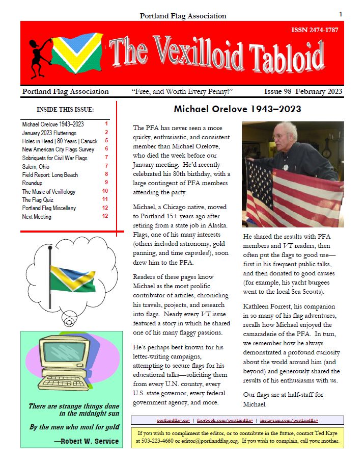 The 76th edition of our newsletter features: Genesis of Good Flag, Bad Flag (Ted Kaye) A "Gray Pride" Flag (David Koski) The Pro-Abortion Gadsden Flag (Ted Kaye) Flaggy Map Flags in School (Michael Orelove) Farewell, Michael Faul & Chumley (Michael Faul) Pirate Flags in the Caribbean (Michael Orelove) The Red Flag (John Cartledge) And, as… Continue reading Vexilloid Tabloid #76